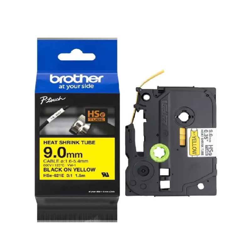 Cinta tubo termocontraible para cables. Texto negro sobre fondo amarillo. Ancho: 9mm. Longitud: 1,5m. Cable recomendado: 1,6mm a 5,4mm.