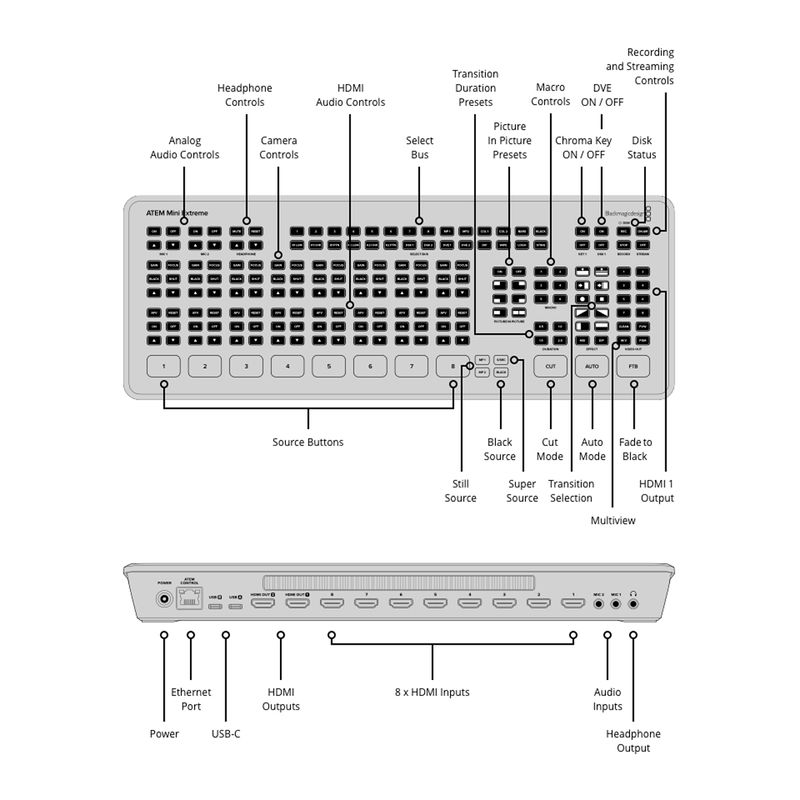 Atem Mini Extreme - Switcher de video con 8 entradas HDMI, 2 salidas HDMI independientes, 2 puertos USB y una conexión para auriculares
